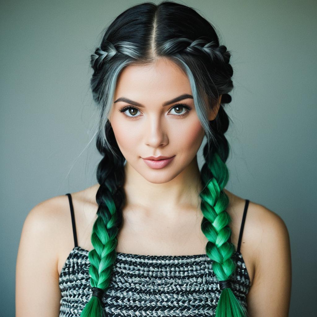 Grey ombre knotless braid ,1girl, solo, braid, realistic, long hair, looking at viewer, twin braids, multiple braids, bare shoulders, black hair, dress, upper body, green eyes, multicolored hair, lips, hair over shoulder