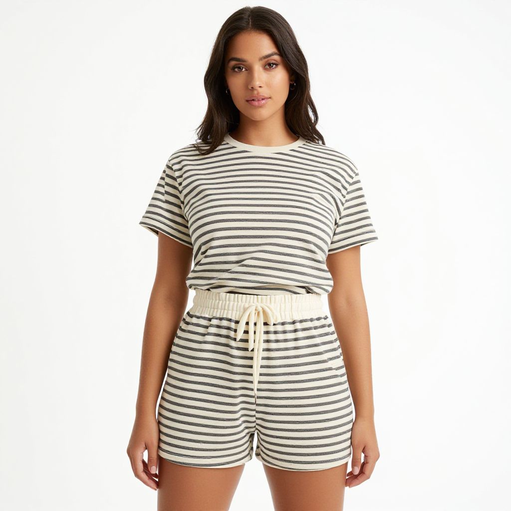 "Woman, casual chic, striped t-shirt and shorts co-ord set in cream and black, crew neck, short sleeves with a tie detail, elastic waist shorts, relaxed fit, plain white background. Sexy. Pretty face and beаutiful eyes. Big breasts."