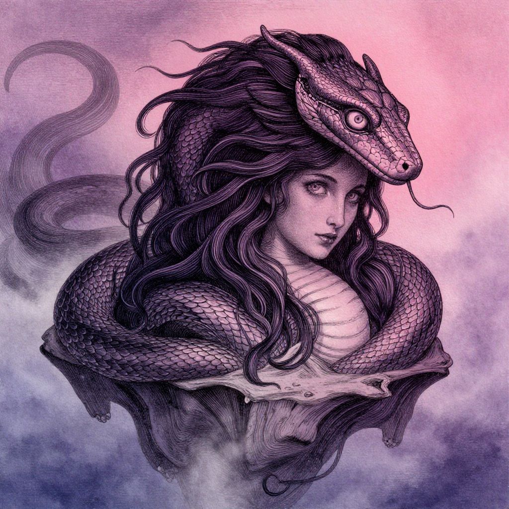 Digital painting of a serpentine woman with glowing orange eyes, golden scales, and dark green hair, framed by an ornate arch.