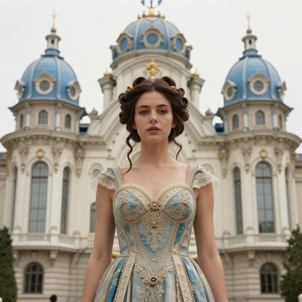 A woman with intricate hair and a detailed dress stands in front of an ornate, Art Nouveau-style building with blue domes and towers.