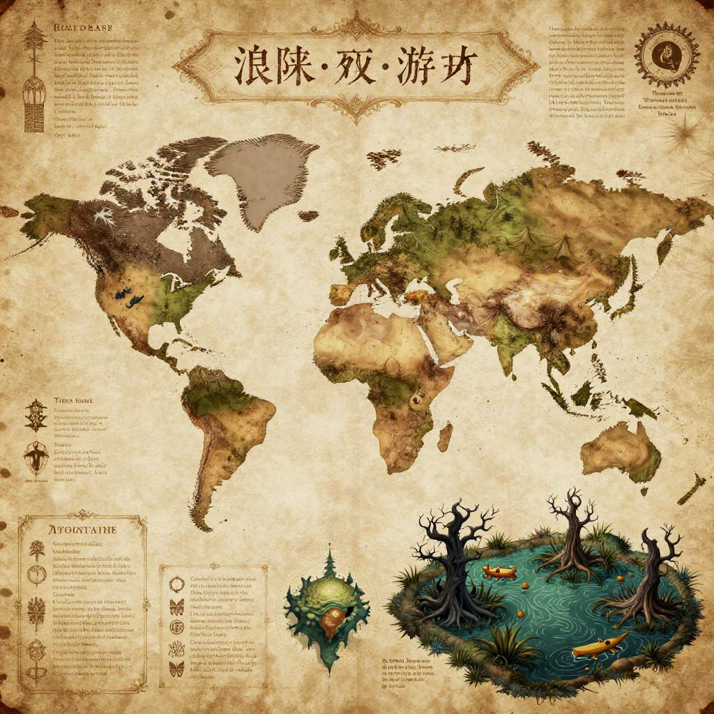 World map creator DnD inspired, high-detail fantasy atlas page showcasing various biomes including snowy mountains, deserts, mystical islands, and dark swamps, surrounded by lore notes and fantasy symbols, aged paper background with ink splatters and map legends.