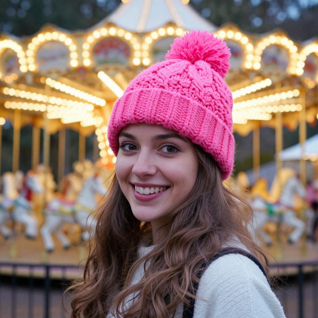 Radiant smile of a young woman wearing a vibrant pink knitted hat with a fluffy pom-pom, set against a festive Christmas backdrop featuring a glowing carousel and enchanting bokeh lights, creating a warm and magical New Year ambiance.