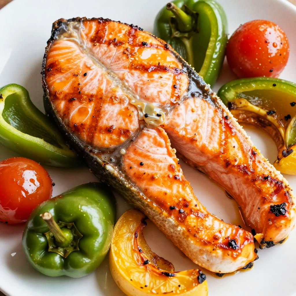 Close-up photo of two perfectly grilled salmon fillets, with a glossy, caramelized surface. They're placed on a colorful medley of roasted vegetables, including green bell peppers, red tomatoes, and yellow squash. The vibrant colors and textures of the vegetables contrast beautifully with the rich, orange-brown hue of the salmon. The image is brightly lit, highlighting the juicy, succulent appearance of the fish.