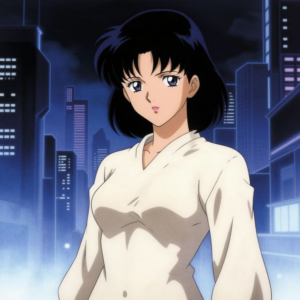 Anime-style digital drawing of a serious-looking woman with short black hair, wearing a white blouse, against a futuristic cityscape at night.