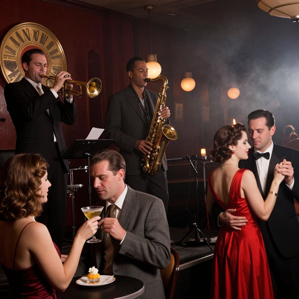 50's jazz club interior with smoky atmosphere, a live band playing trumpet and saxophone, elegantly dressed patrons dancing and enjoying cocktails, dim lighting highlighting the stylish outfits and decor from the era.