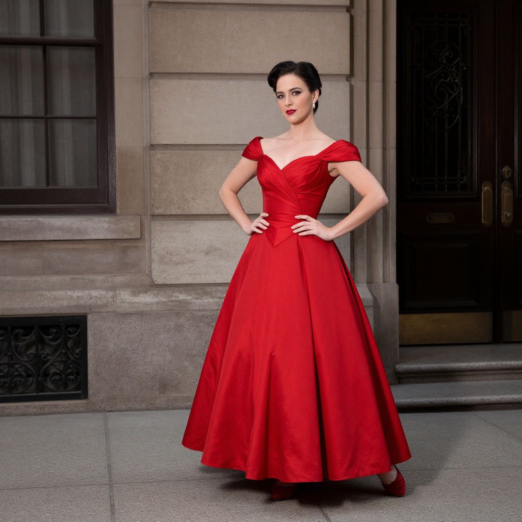 Photograph of a fair-skinned woman in a red, off-shoulder, full-skirted gown, standing confidently with hands on hips,