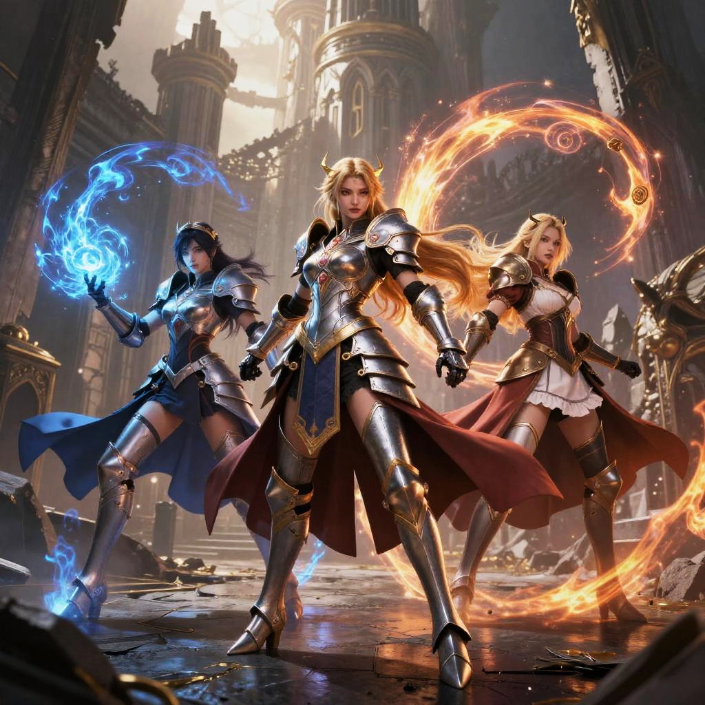 Raid Shadow Legends characters female, fierce and elegant warrior heroines, enchanted armor with intricate designs, wielding swords and magical staffs, standing on ancient battlefield ruins, dramatic skies, hyper-detailed digital painting style