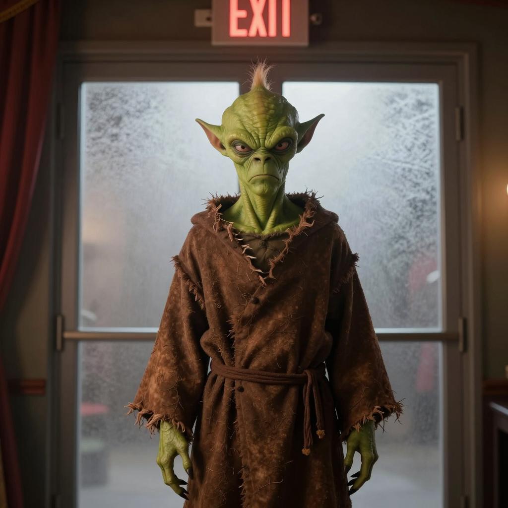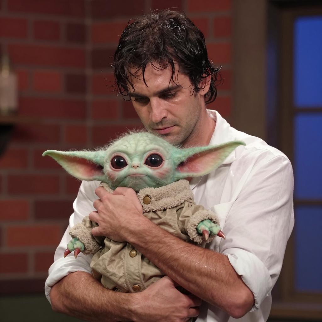 A photograph of a man with dark, wet hair, wearing a white shirt, holding a green, ured, alien-like creature. The man has a focused expression and is hugging the creature. The background has a red-lit, brick wall and blue objects on the right. The man is centered, holding the creature close with both arms.