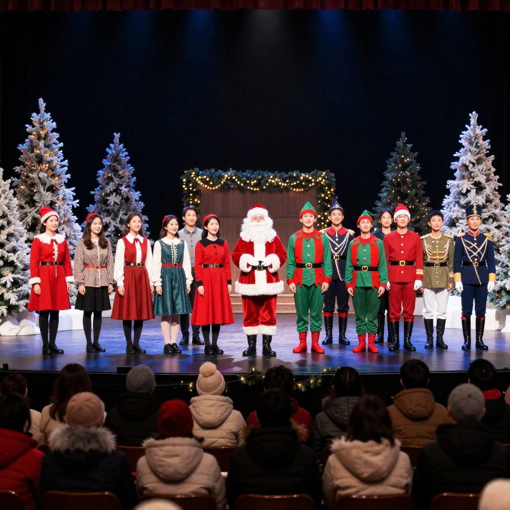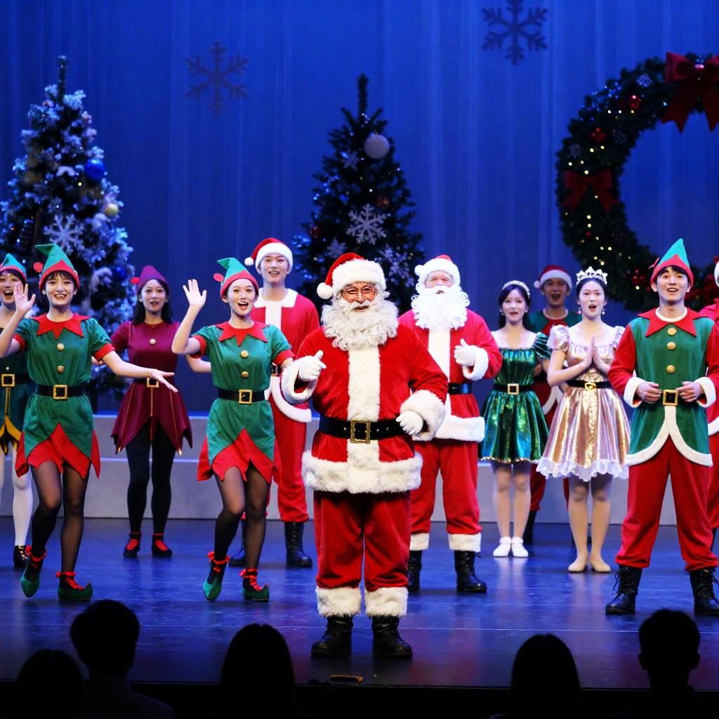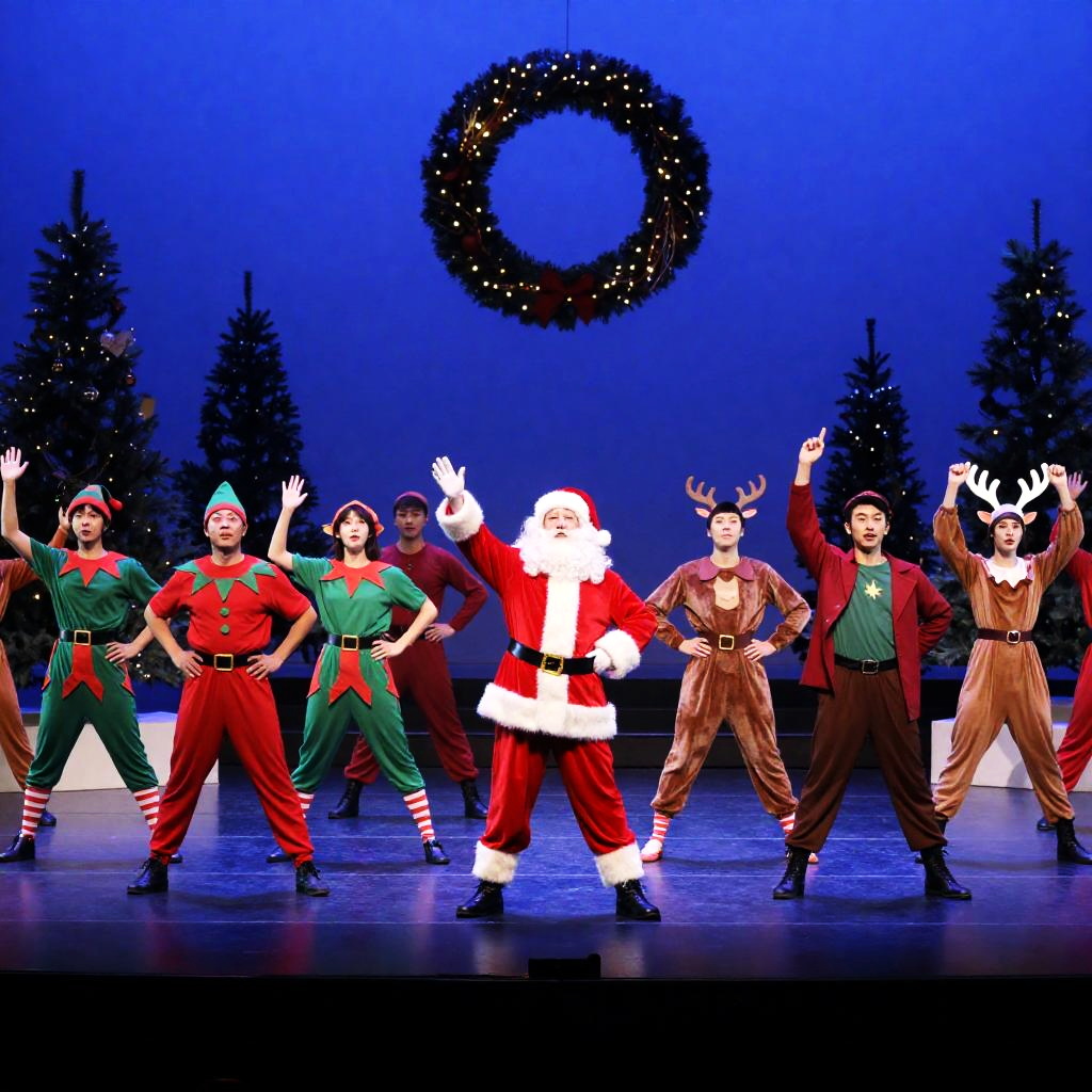 A diverse group of performers dressed in Christmas-themed costumes including elves, Santas, and festive dresses on stage. The central figure wears a classic red Santa suit with white fur trim, smiling intensely. The stage is decorated with blue curtains, snowflake decorations, two Christmas trees, and a large Christmas wreath. Bright stage lighting highlights various poses and joyful expressions. An audience silhouette is visible in the foreground.