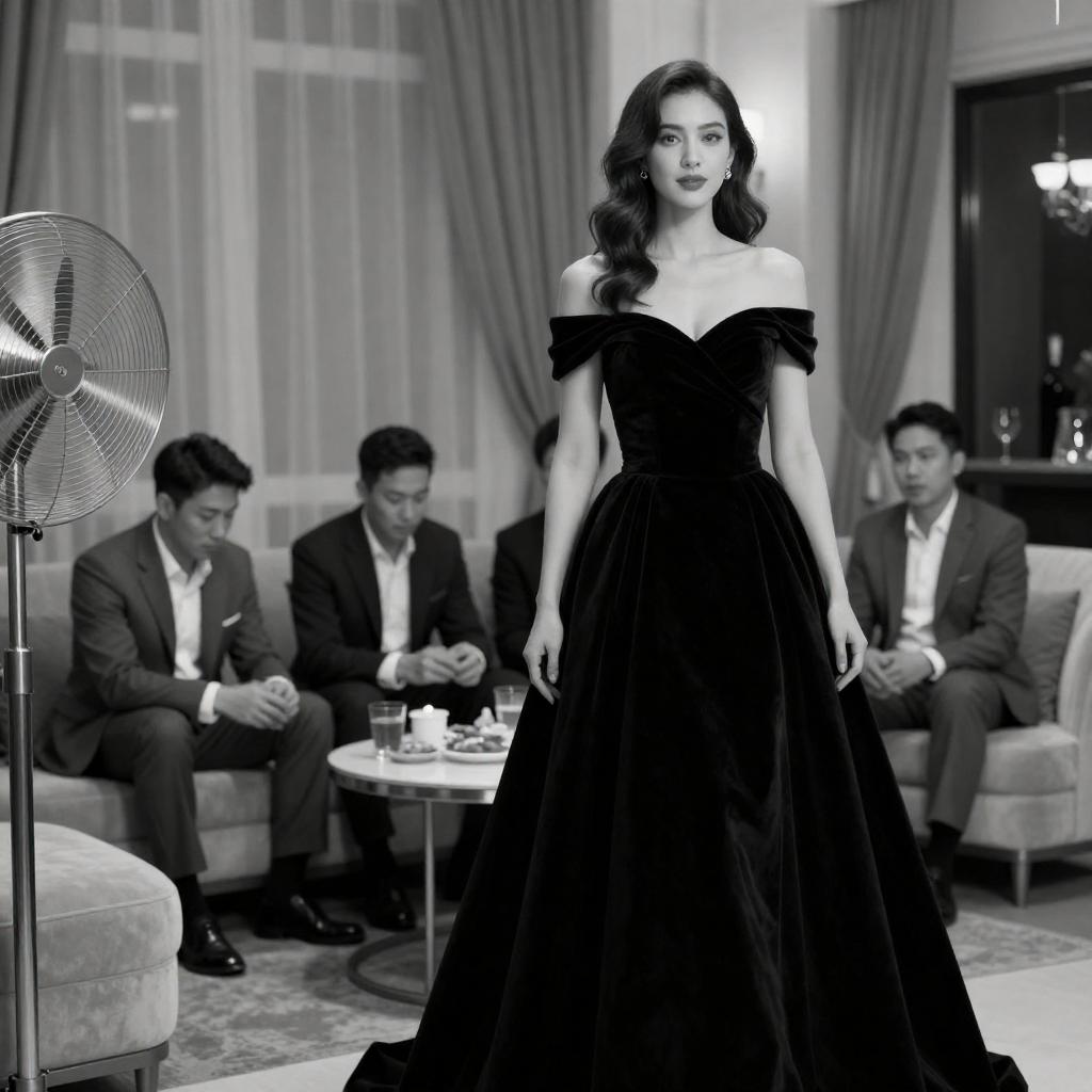 Black-and-white photograph of a woman in an elegant, off-the-shoulder, black velvet gown with a wide skirt, standing in a luxurious room. She has wavy, shoulder-length hair and a confident expression. Three men in suits sit on a couch in the background, focused on a table with drinks and snacks. A large, round, metal fan is on the left. Draped curtains and a round table are in the background.