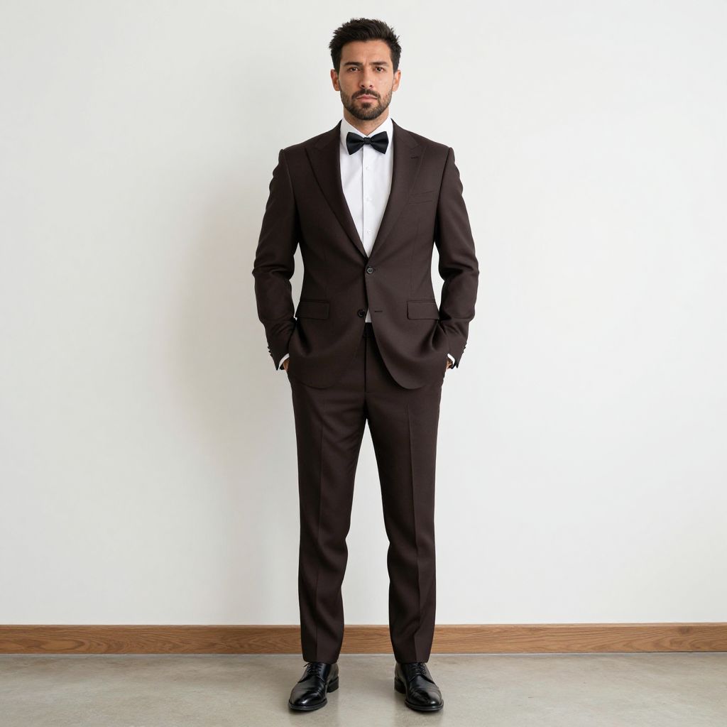 Photograph of a serious-looking, dark-haired man standing against a rough, brown brick wall. He wears a dark purple velvet blazer with intricate gold embroidery on the lapels and cuffs, paired with a black dress shirt and dark gray trousers. His black leather shoes complete the formal look. The textured brick wall contrasts with his polished attire, and the gray concrete ground is visible at the bottom of the image. The lighting is even, highlighting the textures and details of his outfit and the background.