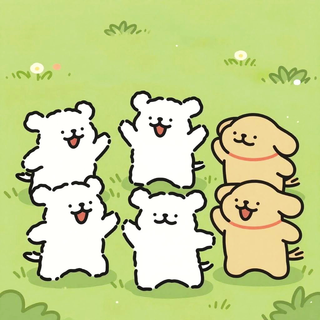 A colorful digital drawing features five cute, cartoon-style bear-like creatures standing in a grassy field with a light green, sunlit background. Three white bears stand on the left, with two raising their arms in excitement. On the right, two beige bears stand side by side, smiling and waving. Each bear has simple, black outlines, round heads, and small, round eyes with pink blushes. Small white flowers dot the grassy background, adding to the cheerful atmosphere. The style is whimsical and playful, with a bright, inviting color palette.