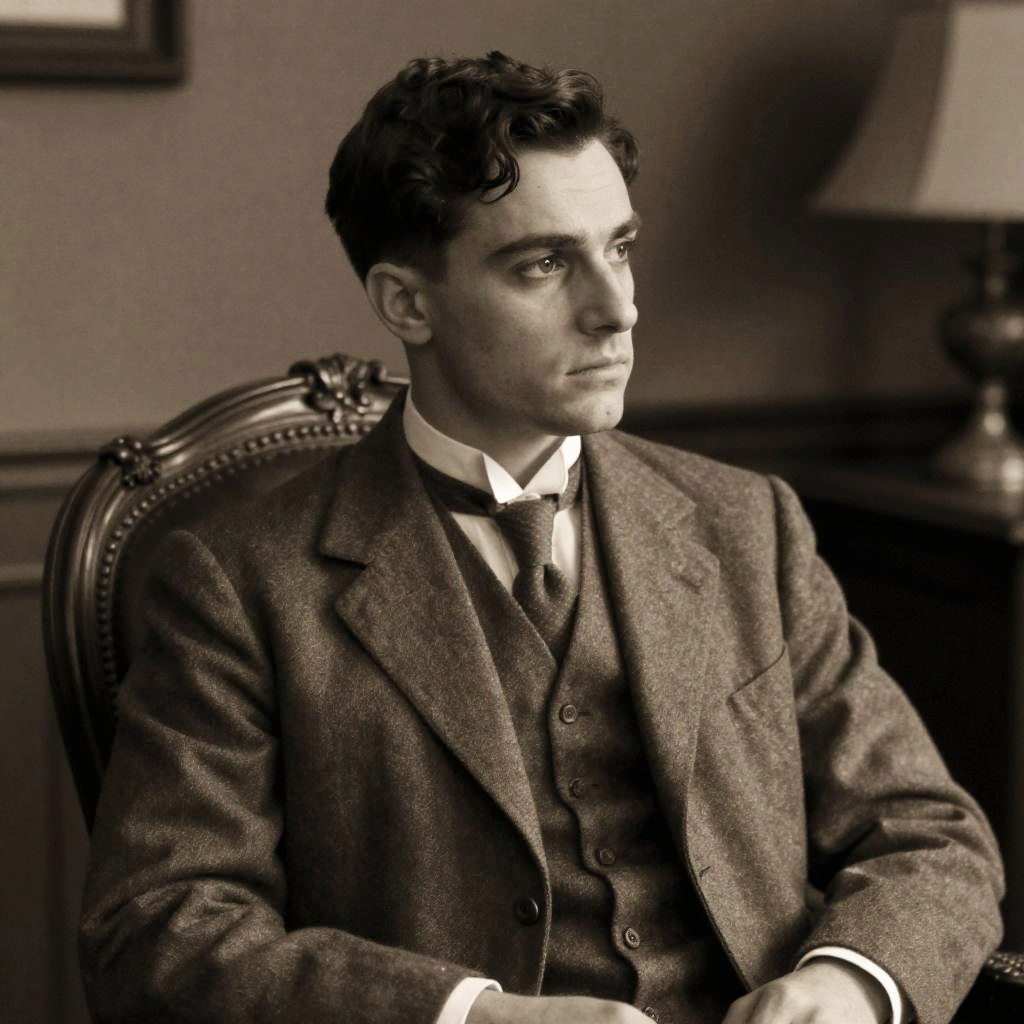 This sepia-toned photograph depicts a young man with dark, wavy hair, sitting in an ornately carved wooden chair. He wears a three-piece, dark wool suit with a white dress shirt and a black bow tie. His expression is serious and contemplative, gazing to the right. The background includes a partially visible framed picture on the left and a table lamp on the right. The image has a vintage, early 20th-century feel, emphasizing the man's formal attire and the classic interior setting. The lighting casts soft shadows, enhancing the textures of the suit and chair.