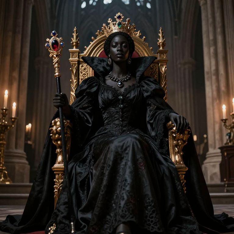 Black queen on throne, powerful and enigmatic, draped in dark flowing fabrics with delicate lace details, holding a scepter embedded with precious gems, sitting amidst a gothic cathedral interior filled with dramatic shadows and candles, evoking mystery and authority.