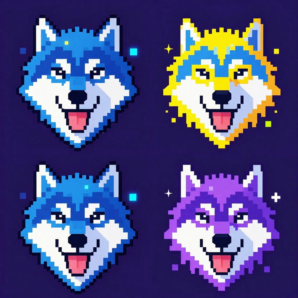 Digital pixel art of four happy, colorful wolf heads: top left blue, top right yellow with sparkles, bottom left blue, bottom right purple,