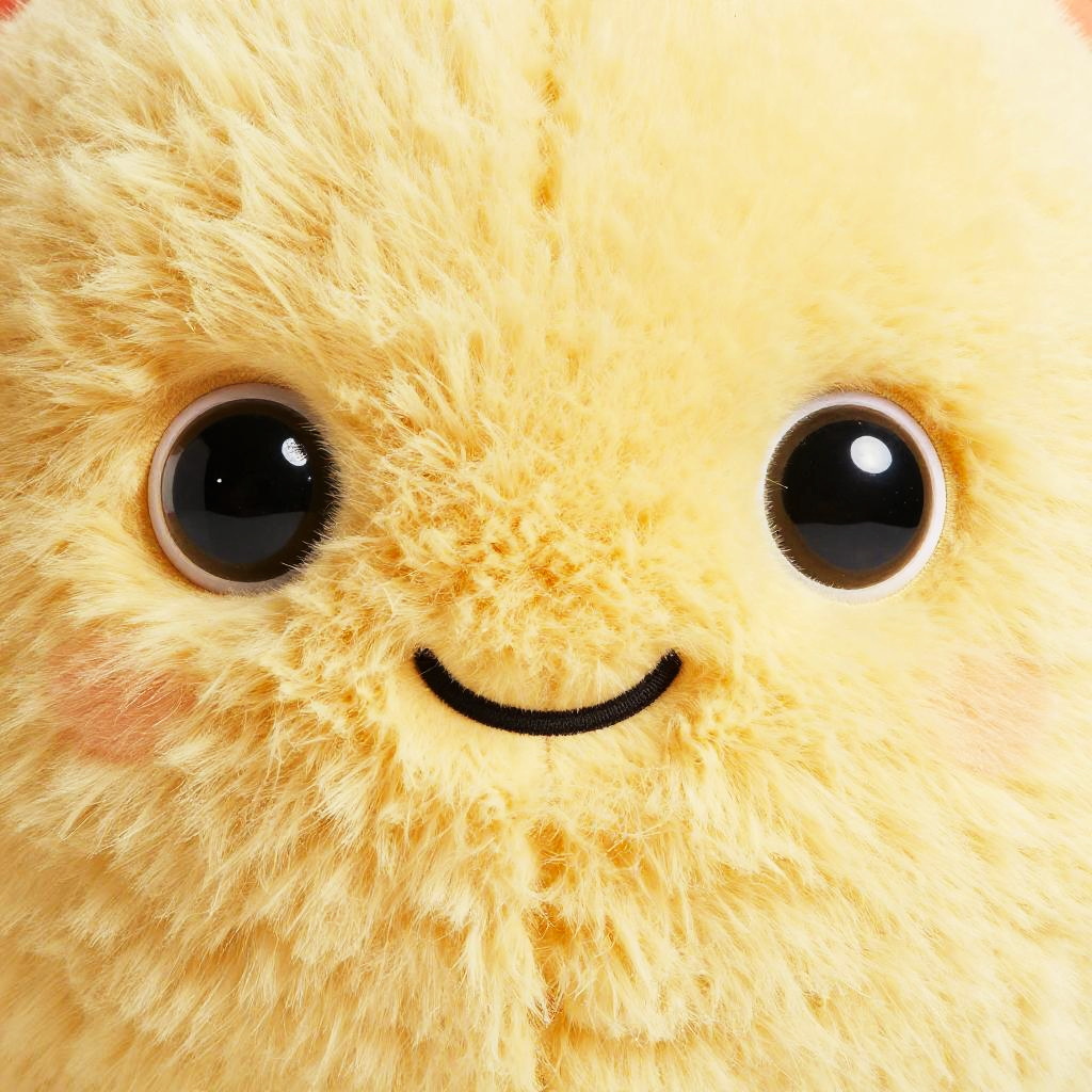 Close-up photograph of a plush toy with a fluffy, yellow, fur-covered face. The toy has large, round, black, shiny eyes with a reflective spot in the upper right eye and a simple, black, curved smile. The fur texture is soft and slightly matted, with a few pinkish blush marks on the cheeks. The background is completely filled with the plush toy's face, emphasizing its cute and adorable features. The lighting is bright, highlighting the toy's fluffy texture and vibrant yellow color. The overall style is whimsical and endearing.