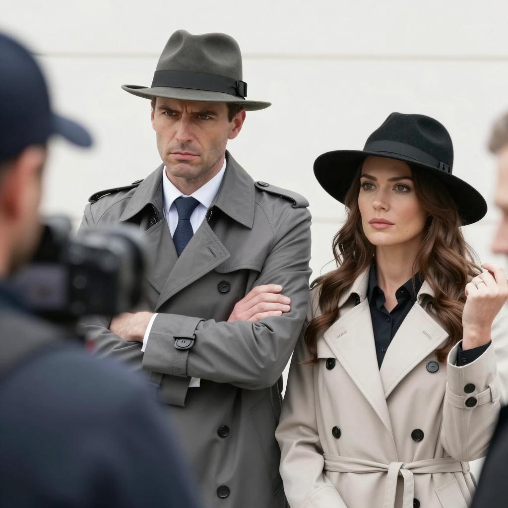 Three adults posing together against a plain white background. The woman in the center wears a sleeveless black dress and has shoulder-length brown hair, standing confidently with her hand on her hip. Behind her are two men; one wearing a black suit, blue shirt, and black fedora hat, smiling gently. The other man wears a red button-up shirt, blue jeans, a beige hat, and holds a silver flask with a neutral expression.