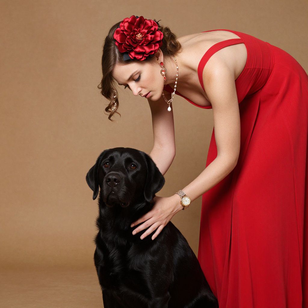 Woman in a vibrant red dress adorned with a matching floral accessory gently strokes a sleek black Labrador Retriever, her elegant jewelry and poised stance creating a harmonious blend of human and canine companionship against a warm, textured backdrop.