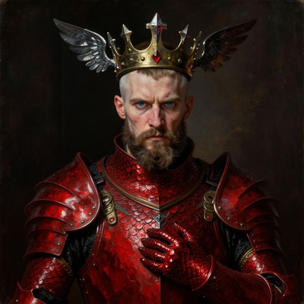 Photograph of a stern-looking, bearded white man with blue eyes, wearing red, scale-patterned medieval armor and a golden crown with black wings on either side. His right hand rests on his chest. The background is dark, highlighting his intense expression and the shiny, reflective texture of his armor. The lighting emphasizes the metallic details and the intricate design of the crown and armor. The image has a realistic, high-contrast style, focusing on the regal and powerful aesthetic of the subject.