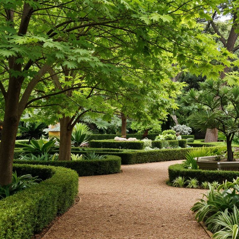 An oasis of serenity emerges where formal design meets natural grace, inviting contemplation amidst the gentle rustle of leaves and the earthy embrace of mulched paths.