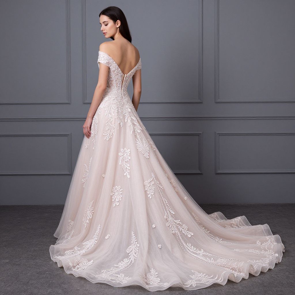 Photograph of a woman in an off-the-shoulder, white lace wedding gown with a long, flowing train, standing against a gray paneled