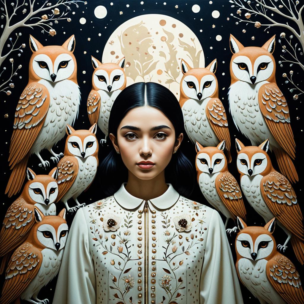 She is a night girl with night animals, in the style of Amy Giacomelli, Morris Hirshfield, Genevieve Godbout. Soft pearlescent colors, extremely detailed, intricate, beautiful, 3D, high definition.