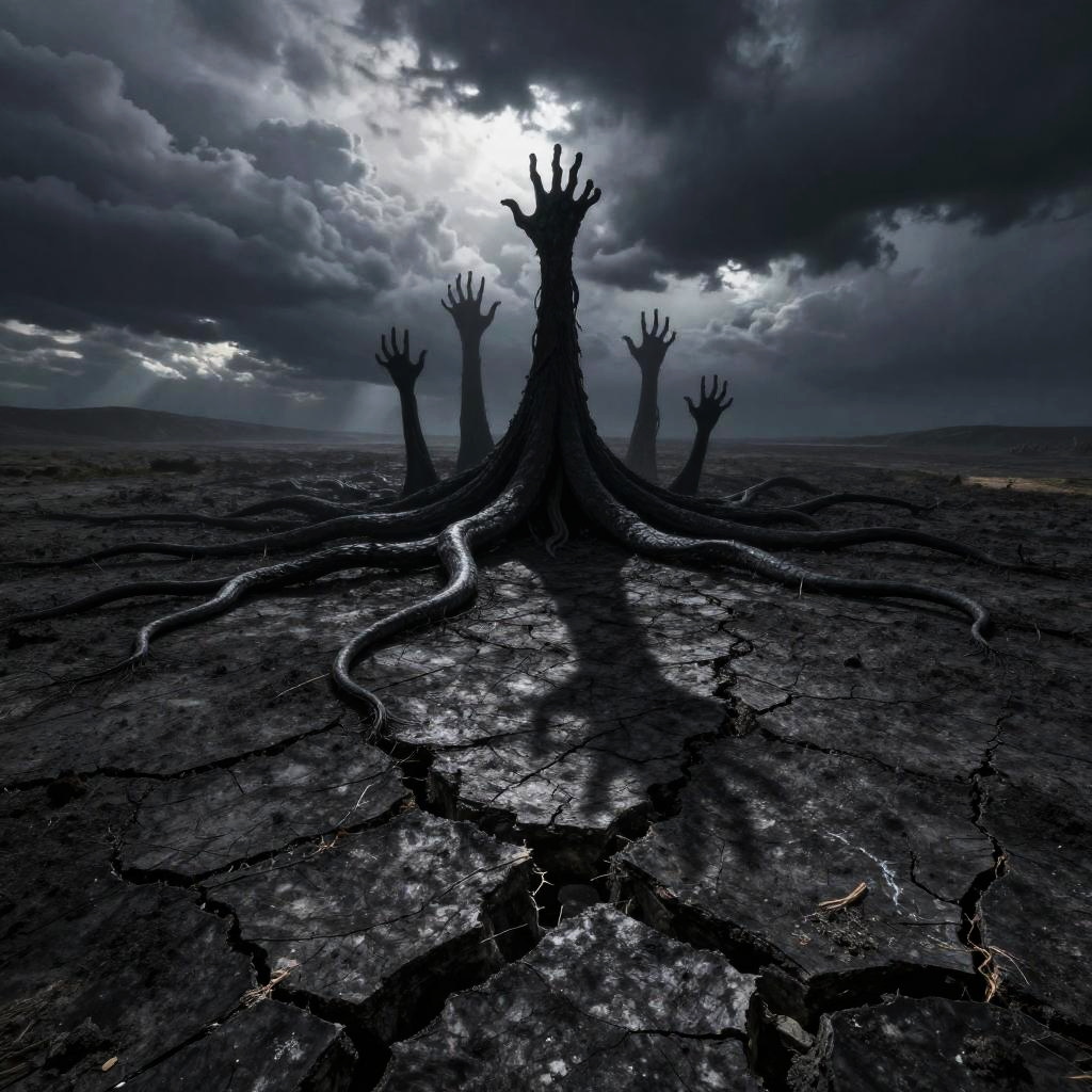 Shadow tendrils extending from a cracked blackened ground, reaching upwards in a desolate landscape, under a stormy sky, vivid textures and moody color palette, fantasy style