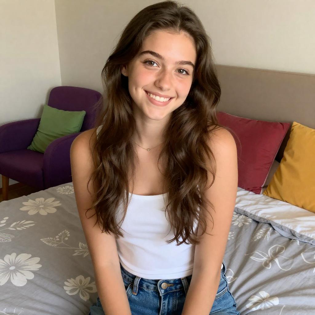 Young woman with long, wavy brown hair, smiling at the camera. She's sitting on a bed with gray floral-patterned sheets, wearing a white tank top and blue jeans. Background includes a purple chair with colorful cushions, beige headboard, and colorful pillows. Casual indoor setting.