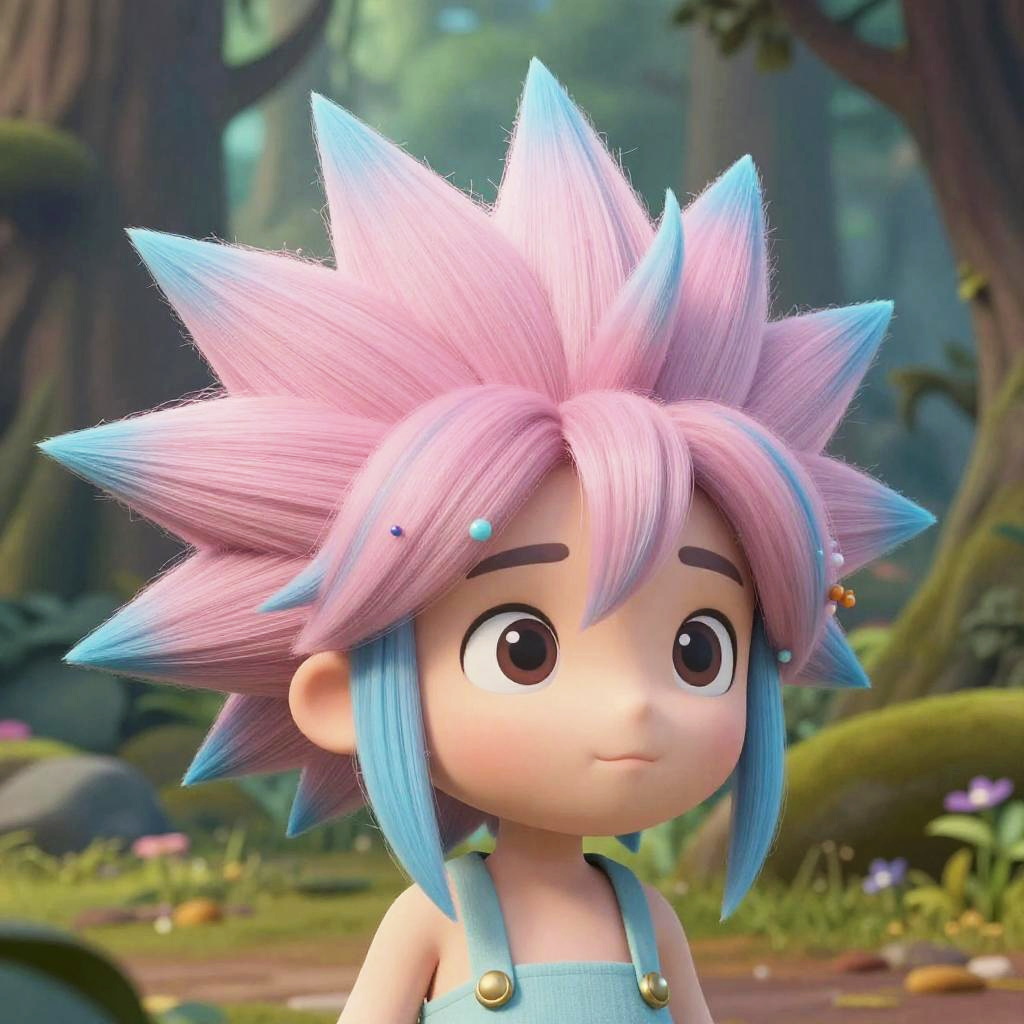 Spiky hairstyles girl with pastel pink and blue spikes, whimsical fantasy forest backdrop, playful expression, soft natural lighting, intricate hair details, anime-inspired illustration.