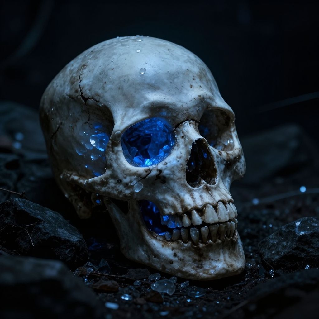 Horror-themed (((realistic, detailed, dark mood))), photo of a skull made of crystalz, glooming from inside in blue light, lying on rocks, (masterpiece), (best-quality), unsettling, dark, spooky, suspenseful, grim, highly detailed