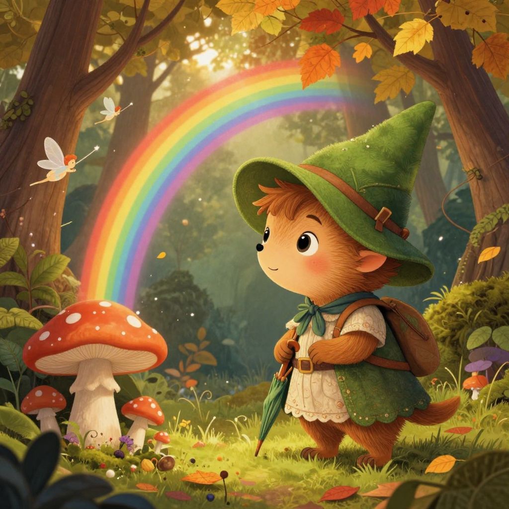 In the whimsical style of a children's book illustration, depict a close-up portrait of a youthful woodland creature adorned in a pointed green hat and clutching a tiny umbrella, their petite features brimming with curiosity as they gaze intently at a lively rainbow emanating from a nearby enchanted mushroom. The scene is gently illuminated by warm sunlight filtering through the vibrant hues of autumn leaves, casting intricate patterns across the verdant, mossy ground and accentuating the fine details of the creature's attire. A soft breeze carries playful, diminutive fairies among the trees, weaving an enchanting and dreamlike ambiance that captivates both young and old alike.