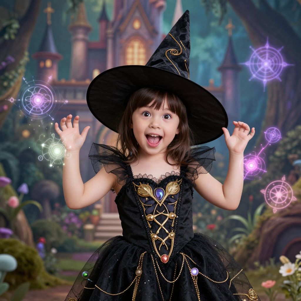 Photograph of a young Asian girl with fair skin and dark brown hair, wearing a black witch costume with a wide-brimmed hat adorned with gold embroidery and a blue gemstone at the center. She has a delighted expression with her mouth open and hands raised, holding glowing purple and blue magical orbs. Her black dress features intricate gold patterns and a lace trim. The background is a whimsical, fairy-tale forest with a castle and lush greenery, creating a magical, enchanted atmosphere. The image is brightly colored and digitally enhanced.