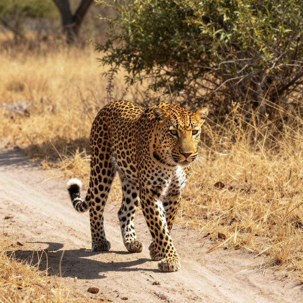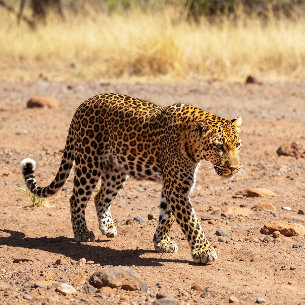 Photograph of a leopard walking across a sunlit, reddish-brown, rocky plain. The leopard's spotted coat contrasts with the bright background, and its shadow stretches out on the ground. The animal is positioned slightly to the right, with its head lowered and tail curved upward. The blurred, yellowish grass in the distant background adds depth to the image.