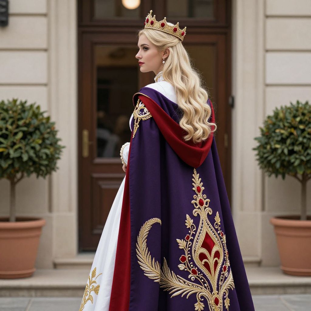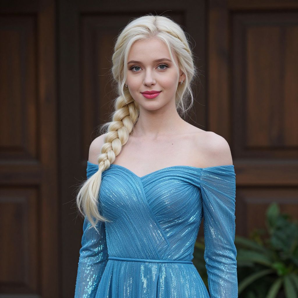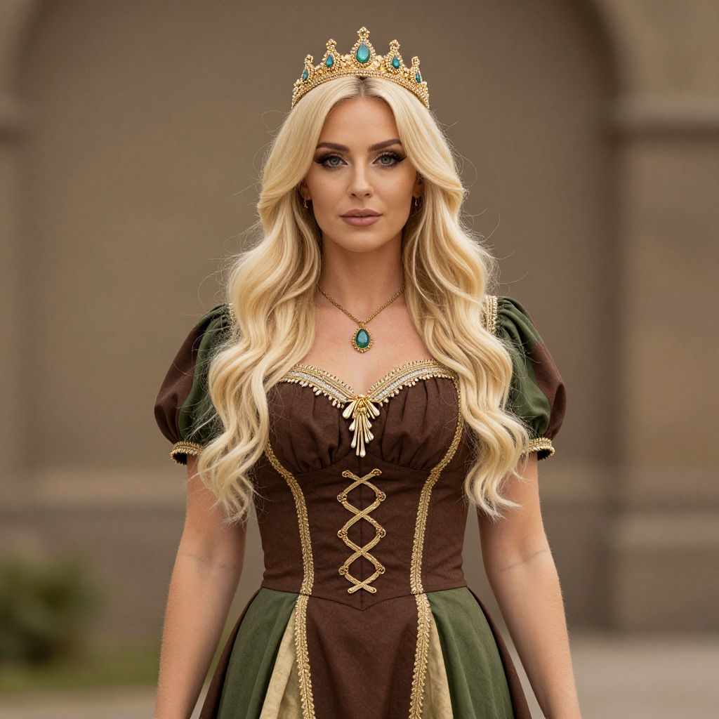 Woman with blonde hair and braids in her hair, wearing a purple and gold dress with a pattern on the front. She is standing in front of a building with a brick wall.