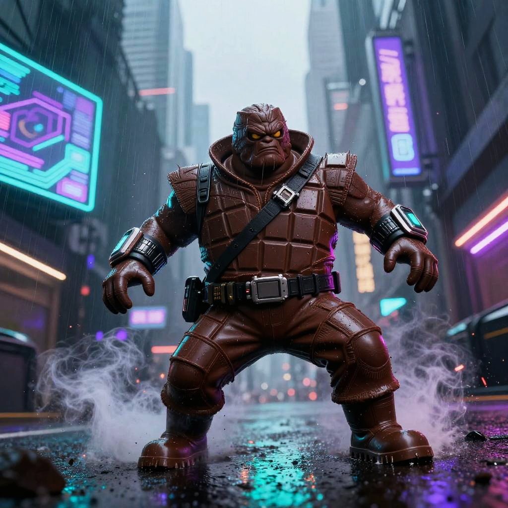 (full body) chunky chocolate brown Himalayan, cyberpunk private eye with glowing wrist tech, in dark, rain-soaked cityscape with holographic ads, teal, purple, and silver predominate, hyper-detailing, hyper-realism, tack sharp, cinematic splash screen energy, action-packed composition, dynamic pose, neon rain reflections, smoke plumes, glossy reflections, dramatic rim light, volumetric fog, motion blur trails, embers, HDR, film grain, photoreal lighting, rich textures, epic mood