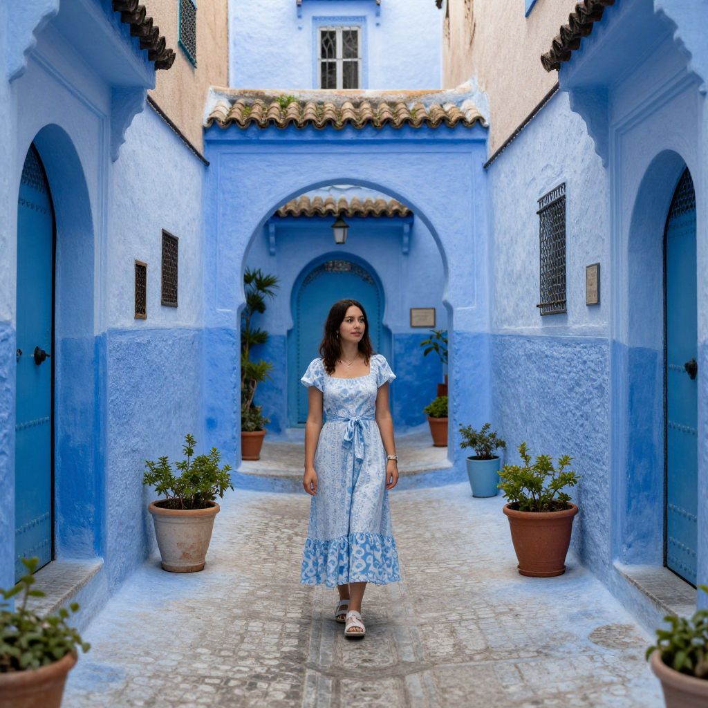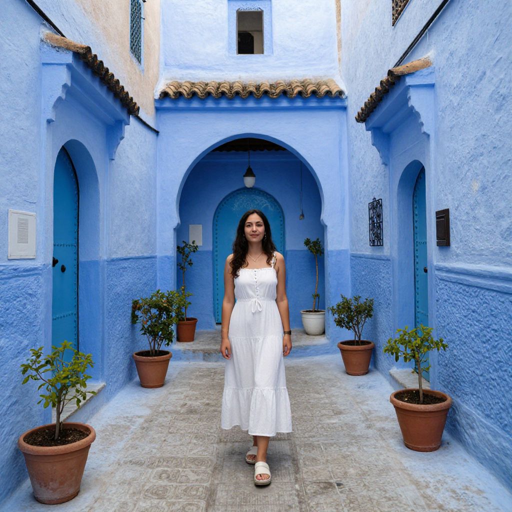 Woman standing in a vibrant blue alleyway in Chefchaouen, Morocco, flanked by arched doorways, cobblestone pavement, and potted plants, exuding a serene and picturesque atmosphere.