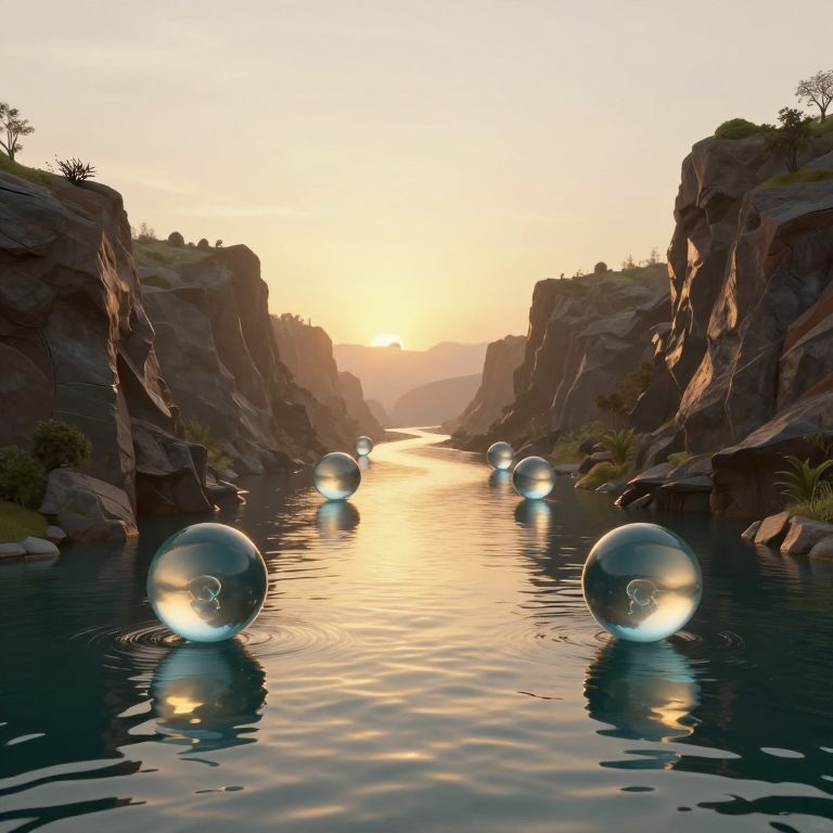 In a surreal 3D-rendered landscape, a tranquil river reflects the ethereal glow of golden hour as it flows toward a distant horizon, flanked by rugged cliffs, while floating glass orbs, each containing the intangible memories of nonexistent beings, drift gracefully above the water's surface.