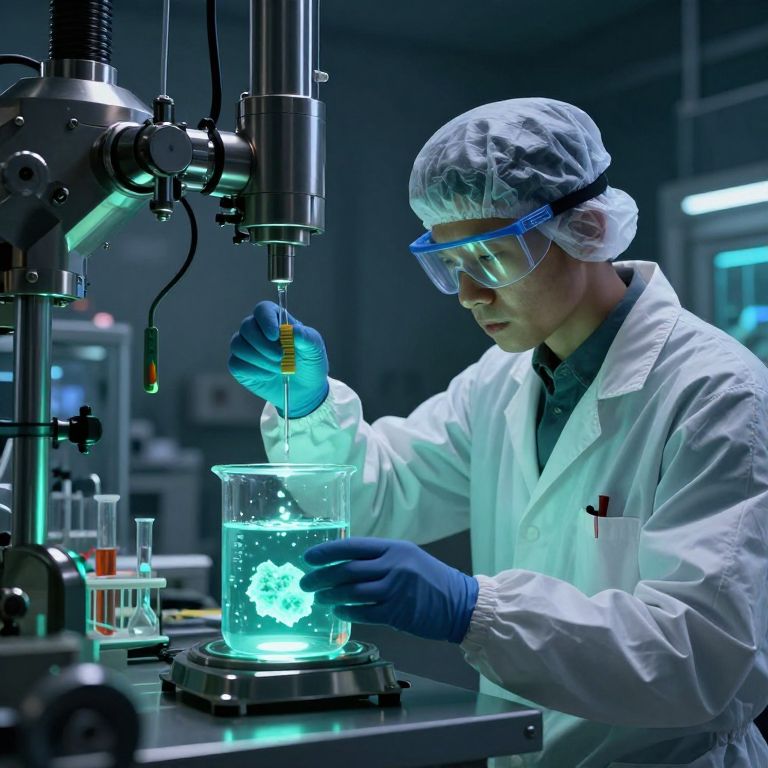 A research chemist wearing a white lab coat, hairnet, safety goggles, and blue gloves carefully examines glowing minerals suspended in a liquid inside a beaker. The beaker is placed on a magnetic stirrer in a secure high-tech laboratory setting. The scene suggests on-site mineral research with advanced scientific equipment and a focus on precise chemical analysis.