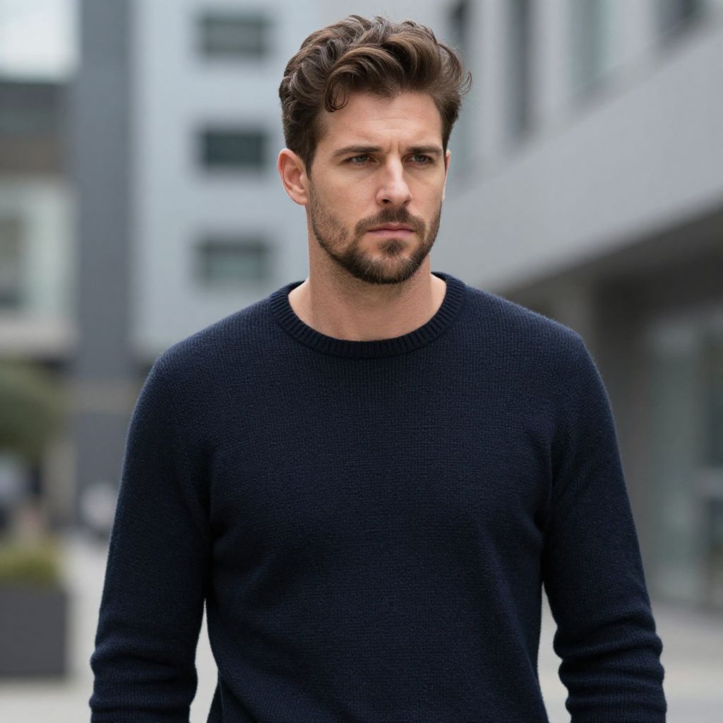 Photograph of a handsome, light-skinned man with short, wavy brown hair and a trimmed beard. He's wearing a dark navy, knit, long-sleeve sweater, standing in an urban, slightly blurred background with modern, gray buildings. His expression is serious and slightly pensive, with a hint of stubble on his face. The lighting highlights his facial features and the texture of his sweater.