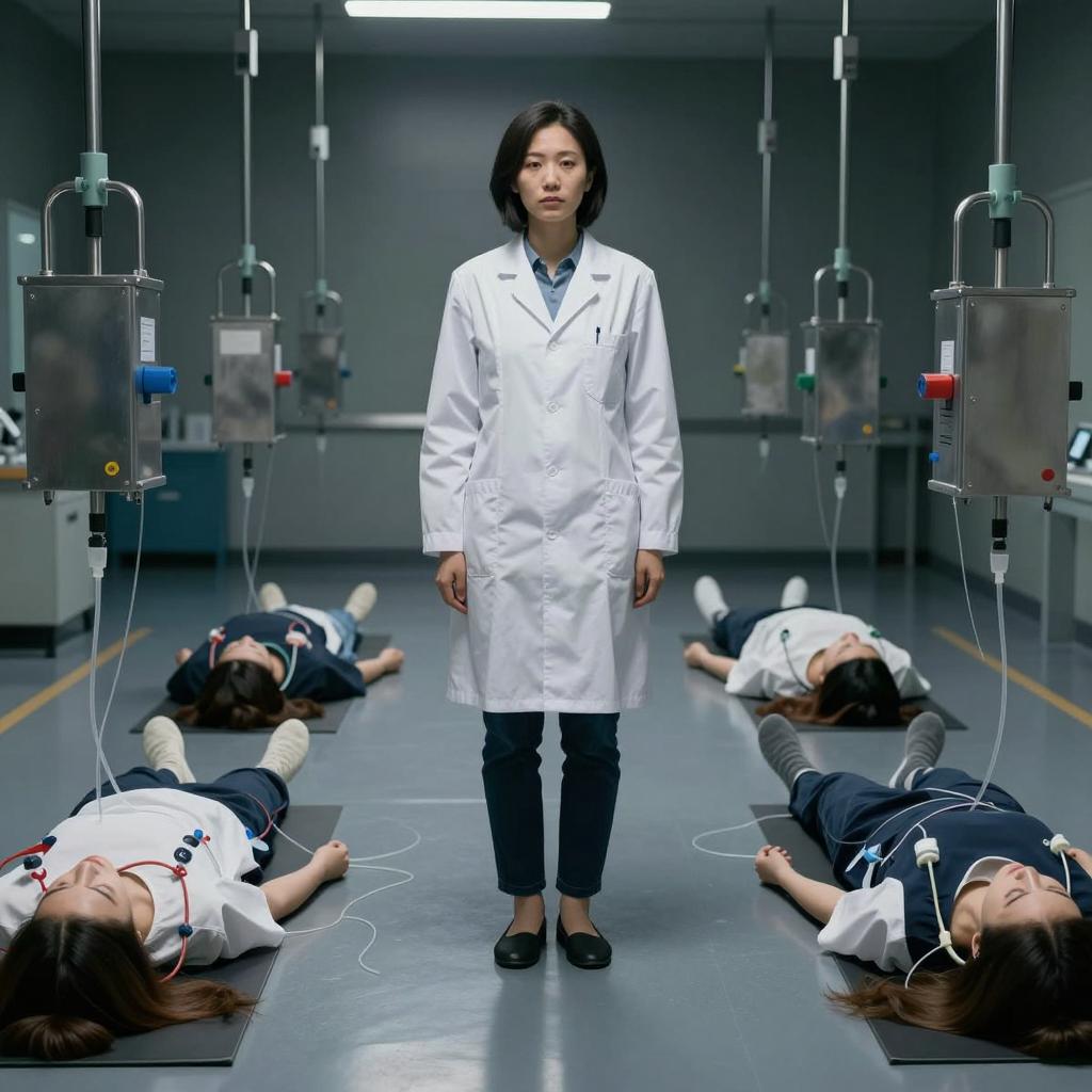 A woman in a white lab coat stands in a dark, industrial room. Multiple nude women with tubes attached to their bodies lie on the floor. The room is filled with hanging metal equipment. The woman in the lab coat has short dark hair and a neutral expression. Five women are suspended and lying down. The floor is shiny and reflective.