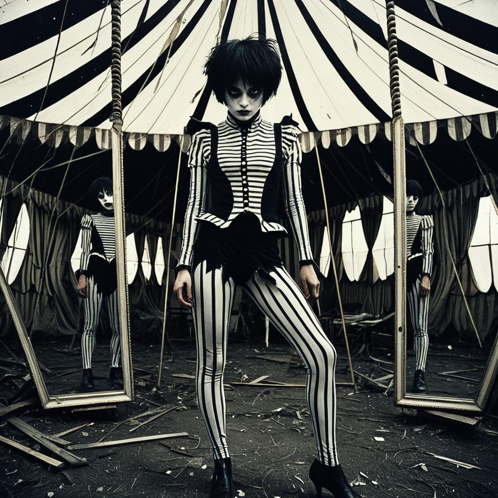 A gaunt acrobat with demented wide eyes stands inside an abandoned big top tent. The subject is dressed in a black and white torn circus costume featuring striped leggings and a fitted jacket with ruffles. Distorted full-length mirrors surround the acrobat, reflecting eerie images that enhance the unsettling atmosphere of the scene. The tent is large with a striped canopy and ragged interior. The style resembles intricate horror illustration.