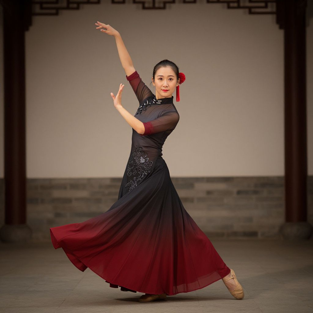 Photograph of an Asian ballerina in a black and red dress, red flower in hair, dancing with arms gracefully raised, in a traditional Chinese
