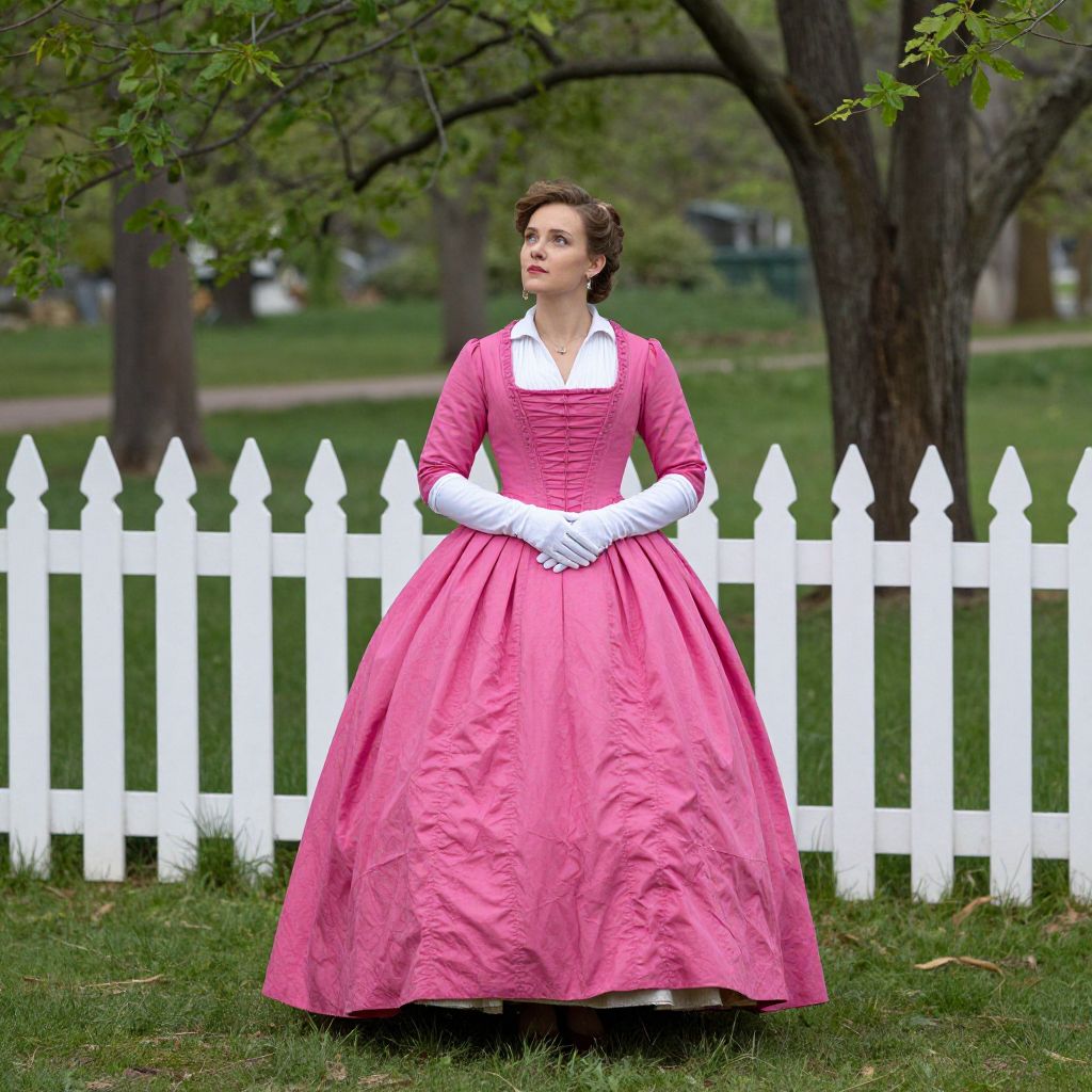 Woman wearing a vibrant pink American Civil War-era ball gown stands gracefully in a lush green park, her hands elegantly clasped in white gloves as she gazes upward, framed by a white picket fence and leafy trees in the background.