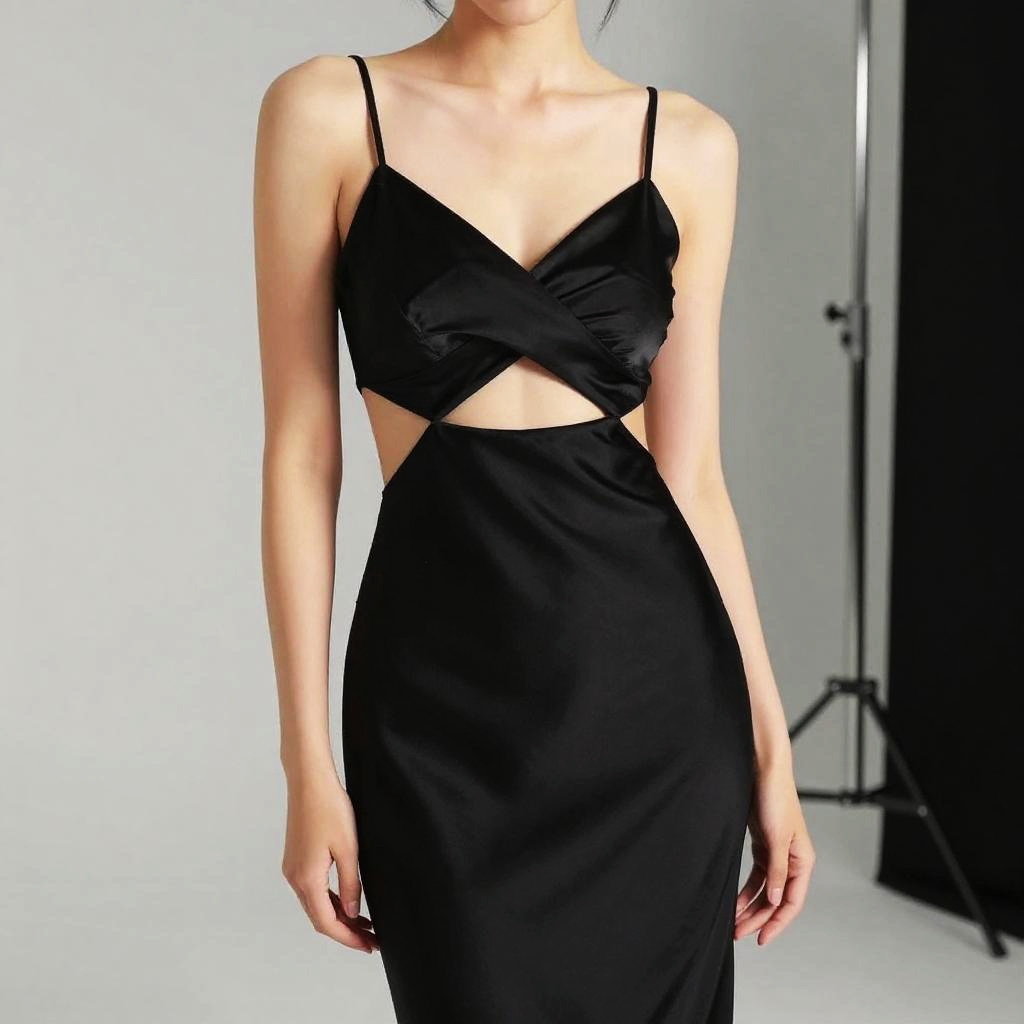 Black dress with cleavage cutout, elegant evening gown, sleek satin fabric, soft lighting, glamorous fashion shoot, high detail, modern style, studio background