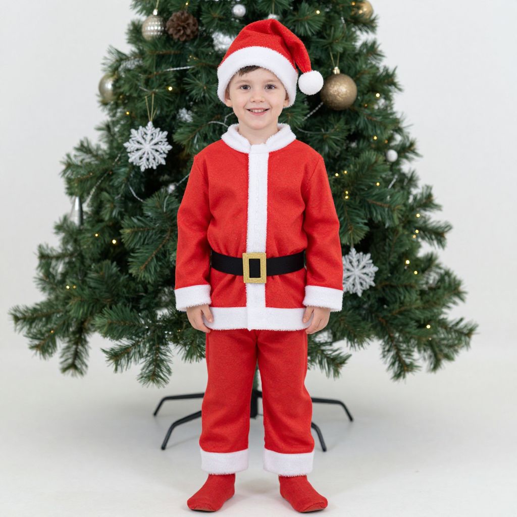 Santa Costume Boy, boy in santa claus outfit standing in front of a christmas tree