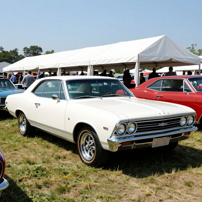A high-definition, vintage-style photograph captures a pristine 1965 Chevrolet Chevelle Z16 Malibu SS 396, showcasing its classic lines and chrome details against a backdrop of a sunny outdoor car show featuring other retro vehicles and a crowd under a white tent.
