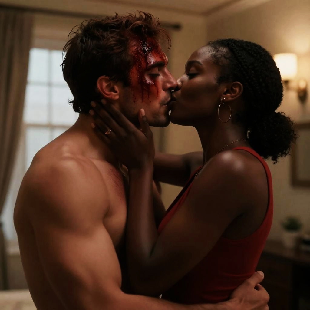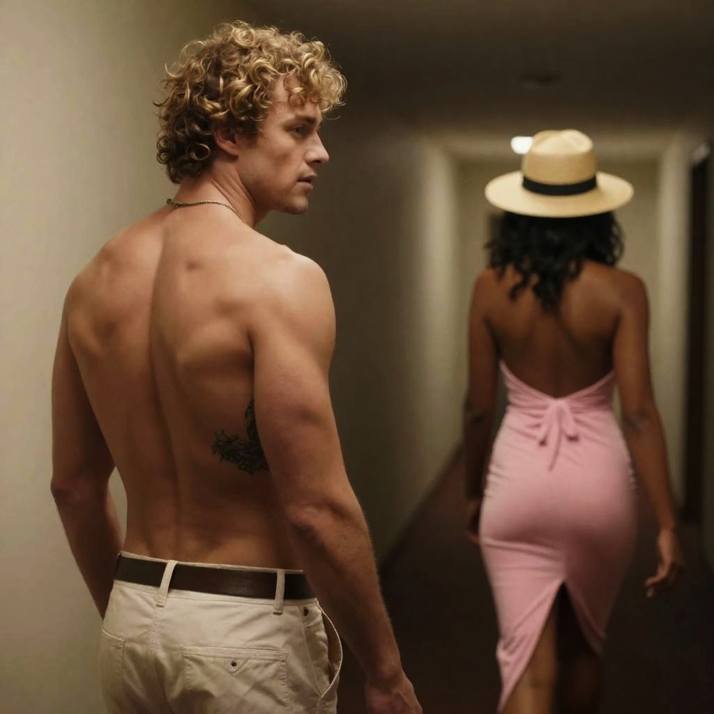 Photograph of a muscular, shirtless man with curly blond hair and a tattoo on his lower back, looking to the right. A woman with a tan skin tone, dark hair, and a pink, backless dress with a slit walks away from him down a dimly lit hallway. She wears a straw hat. The man's expression is neutral. The hallway has a beige wall and a dark carpet.