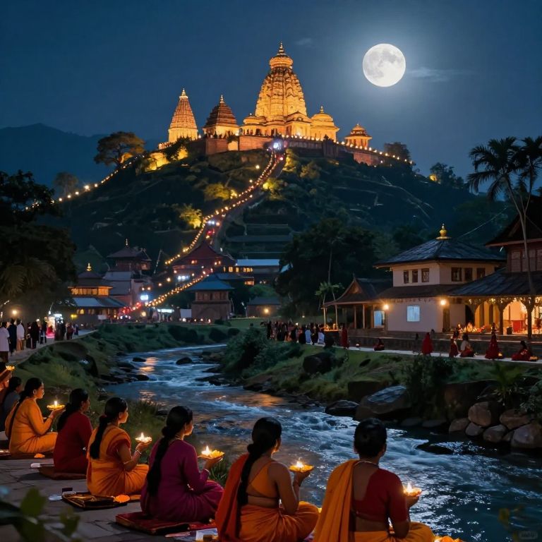 Photograph of a nighttime scene in front of a illuminated, multi-tiered Hindu temple on a hill, lit by warm yellow lights. The full moon is bright in the dark blue sky. In the foreground, five people in saffron and pink traditional Indian attire sit on the riverbank, holding lit diyas (small clay lamps). Strings of lights stretch from the temple down to the river. Palm trees and traditional houses are visible on either side. The river reflects the diyas' glow and the moonlight. The overall atmosphere is serene and spiritual.