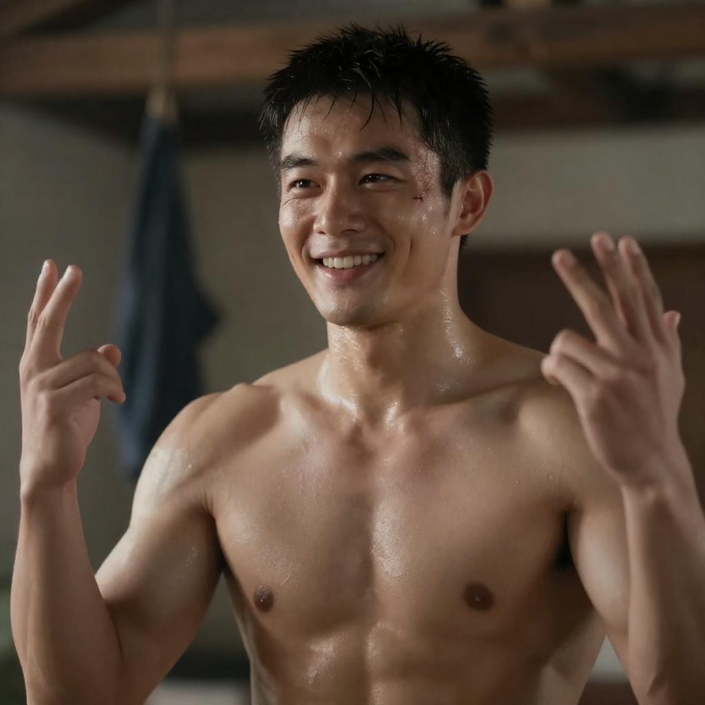 Photograph of a muscular, shirtless Asian man with short black hair, smiling, and raising both hands with fingers spread. His skin is glistening with sweat, and he has a small cut on his right cheek. The background shows a blurred indoor setting with wooden beams and hanging clothes.