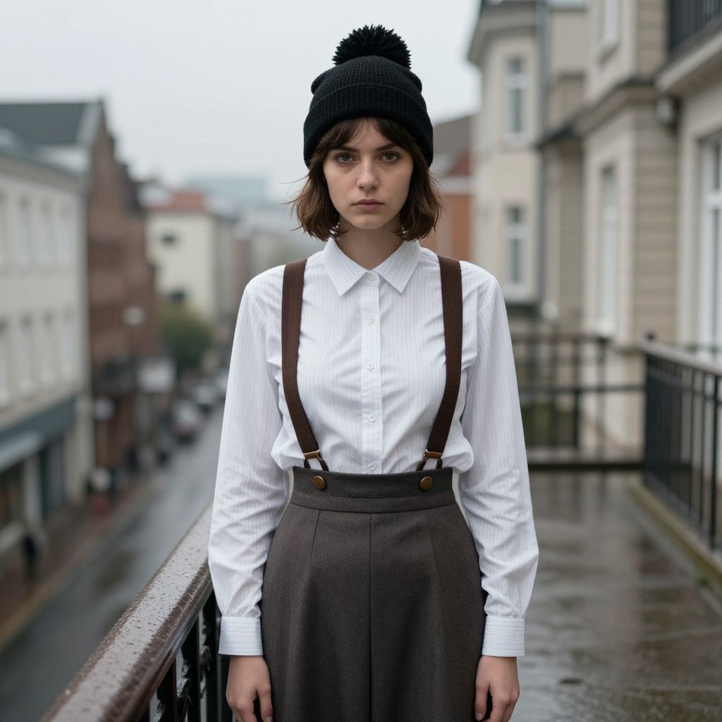 Photograph of a young woman with fair skin and short brown hair, wearing a black hat with a pom-pom, white pinstriped blouse, and brown suspenders over a high-waisted gray skirt. She stands on a rainy urban balcony, with blurred city buildings and a wet street in the background. Her expression is serious, and the overcast sky adds a moody vibe.